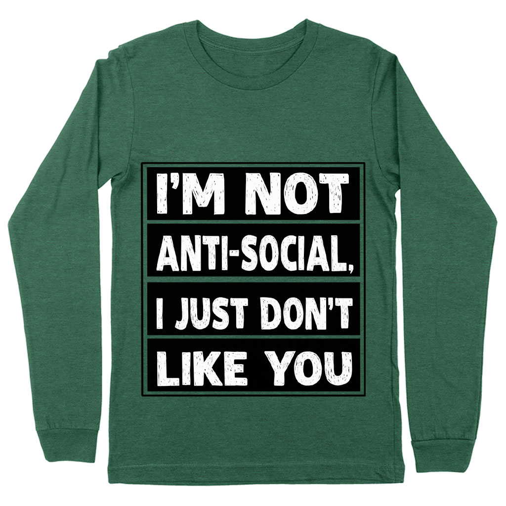 I Don’t Like You Long Sleeve T-Shirt is proudly made with 7x less water than average manufacturers, in recycle-friendly facilities that also guarantee zero sweatshop conditions. Sarcastic Long Sleeve T-Shirt is designed and printed in California.